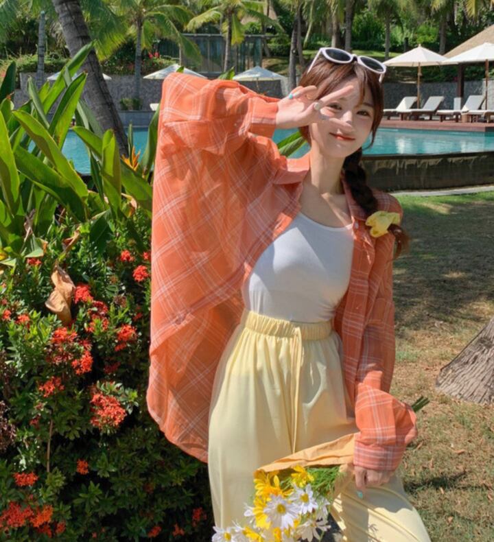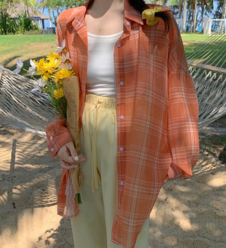 チェック柄 シアー シャツ 長袖 薄手 透け感 トップス カジュアル おしゃれ こなれ感 ラフ 春 夏 お出かけ アウトドア リゾート 海 プール 着回し 普段使い 韓国系 ファッション M L XL 白 ホワイト 黒 ブラック ピンク オレンジ AS10351
