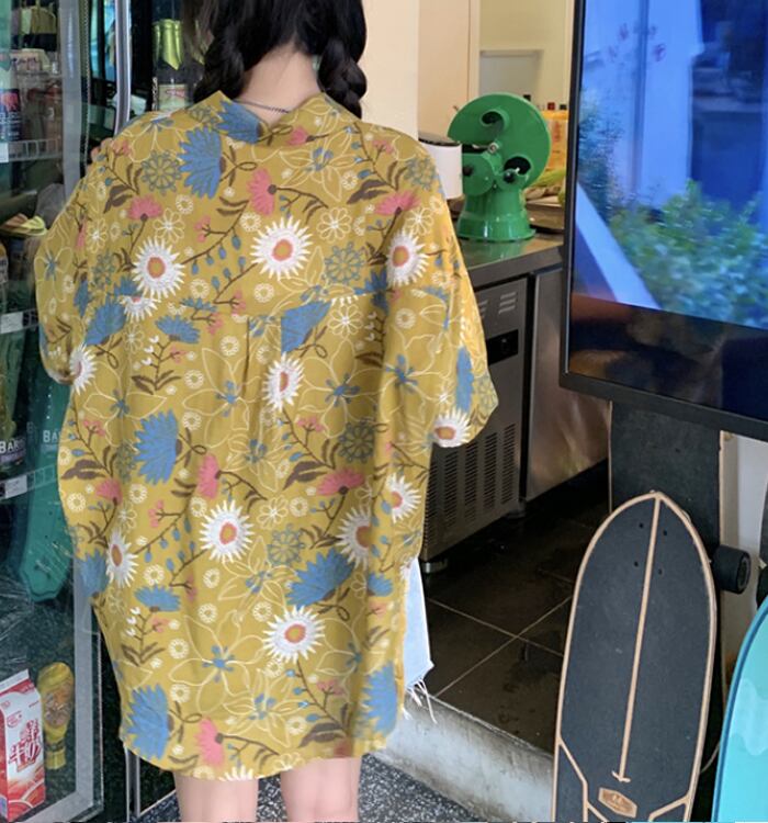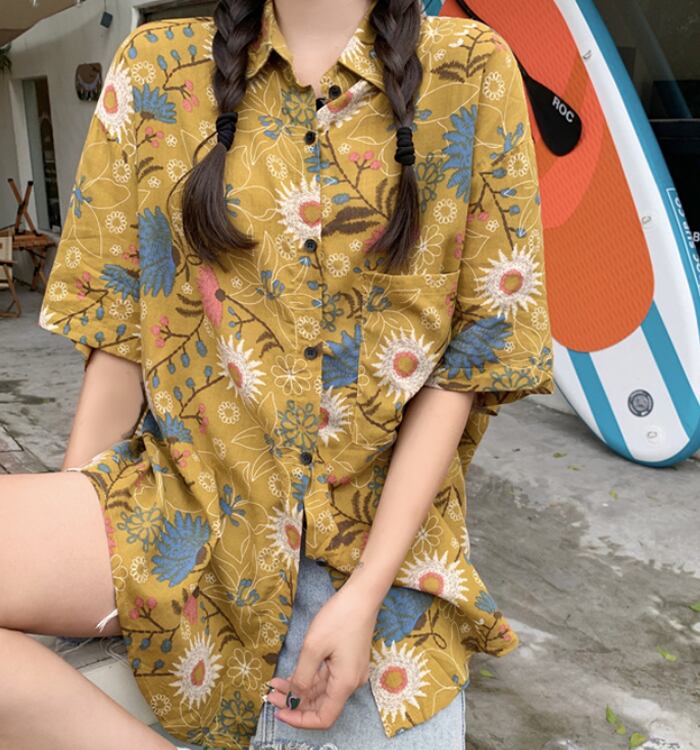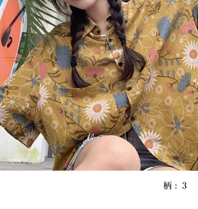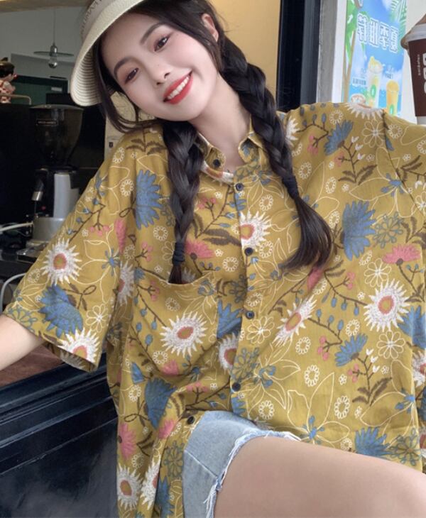 レトロ フラワープリント シャツ 花柄 半袖 トップス ミディアム丈 カジュアル おしゃれ お洒落 アジアン 派手 エスニック こなれ感 ラフ キュート 個性的 主役級 存在感 夏 お出かけ アウトドア リゾート 普段使い 体系カバー フリーサイズ ビッグサイズ ゆったり レッド ブルー イエロー AS10353