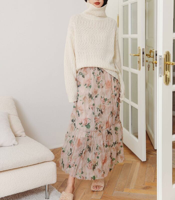 軽やかで華やか。レトロなバラ柄のロングスカート。