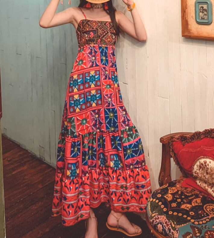 エスニック キャミソールワンピース ボヘミアン アジアン ロング丈 刺繍 カジュアル おしゃれ レトロ エキゾチック こなれ感 個性的 セクシー 主役級 存在感 夏 アウトドア パーティー イベント リゾート 海 プール 普段使い 体系カバー S M L XL 赤 レッド 青 ブルー AS10366
