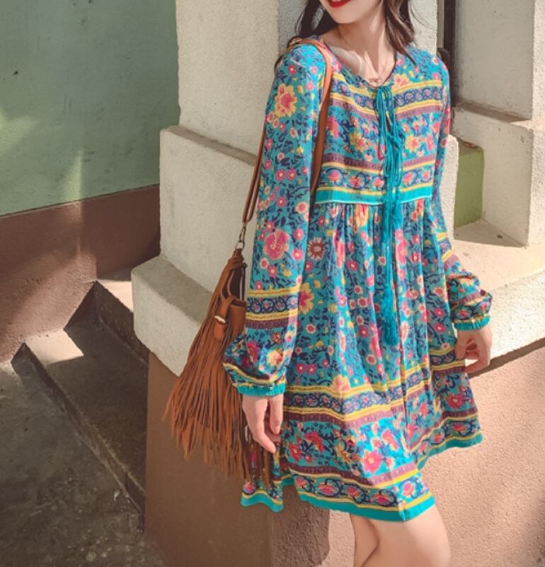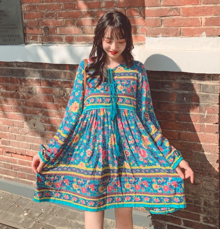 エスニック 長袖 夏 Vネック ミニ丈 フレア かわいい おしゃれ レトロ アジアン ラフ キュート 個性的 主役級 存在感 夏 お出かけ リゾート 海 楽ちん 体系カバー S M L 赤 レッド 緑 グリーン ピンク AS10367