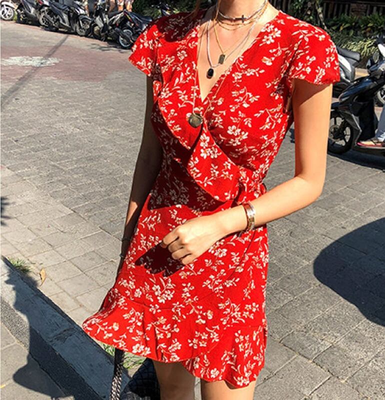 花柄 赤 レッド ワンピース ミニ丈 Vネック ビーチ フリル フレア おしゃれ レトロ 大人可愛い こなれ感 ラフ セクシー エレガント 主役級 存在感 夏 デート お出かけ パーティー イベント リゾート 旅行 海 プール 普段使い S M L AS10368