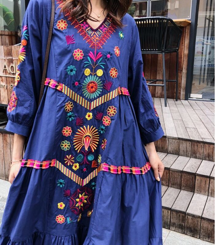 エスニック柄 アジアン ワンピース ロング丈 7分袖 Vネック フレア カジュアル おしゃれ レトロ 大人可愛い ガーリー 主役級 存在感 春 夏 お出かけ アウトドア パーティー リゾート 普段使い 楽ちん 体系カバー S M L XL 白 ホワイト 青 ブルー イエロー AS10377