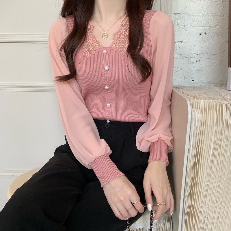 シフォンとニットの異素材ミックスの長袖トップス。