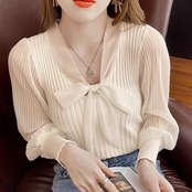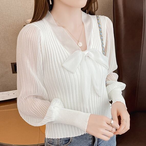 トップス ブラウス ニットソー 袖あり 長袖 Vネック チュール シフォン リボン 透け感 シースルー ニット 異素材MIX かわいい 大人可愛い 上品 おしゃれ お洒落 かっこいい レトロ ラブリー キュート ガーリー エレガント 無地 春 秋 10代 20代 30代 40代 50代 60代 レディース 女性用 お出かけ 休日 着回し 普段使い 重ね着 お揃い 双子 コーデ インスタ映え サイズ S M L XL 小さいサイズ 大きいサイズ 色展開 白 ホワイト 黒 ブラック アプリコット カラバリ