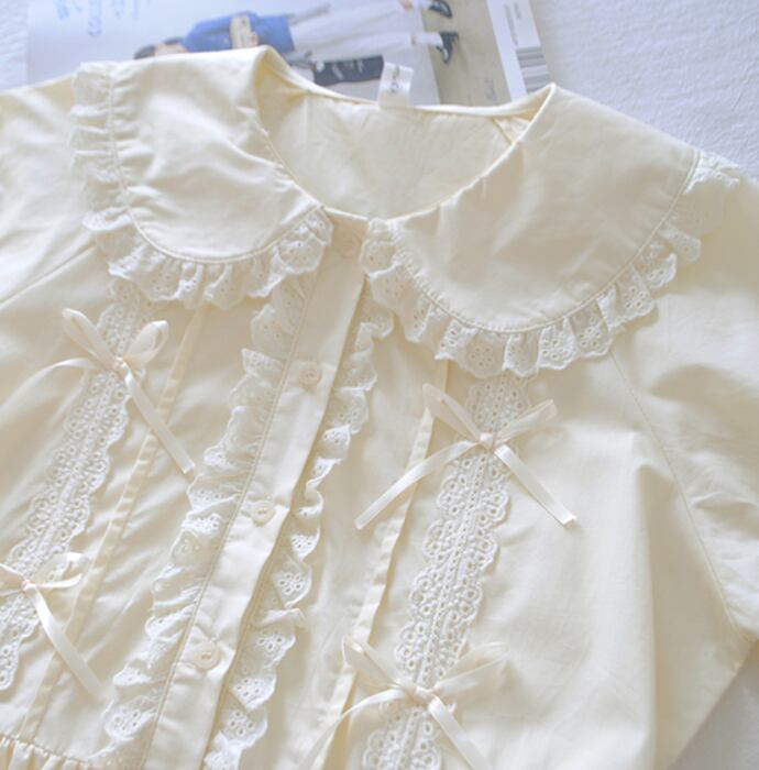 フリル リボン ワンピース 半袖 ひざ丈 パフスリーブ 可愛い フレア おしゃれ レトロ ラフ ラブリー キュート ガーリー 春 夏 通勤 通学 お出かけ 普段使い 重ね着 体系カバー フリーサイズ クリーム AS10404