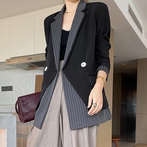 アウター ジャケット 上着 スーツ 袖あり 長袖 Vネック 襟付き アシンメトリー 切り替えデザイン ドッキング かわいい 大人可愛い 大人 上品 おしゃれ お洒落 かっこいい メンズライク マニッシュ 個性的 クール モード系 主役級 存在感 ストライプ 春 秋 10代 20代 30代 40代 50代 60代 レディース 女性用 お出かけ 休日 パーティー イベント 着回し 重ね着 コーデ スタイル モテ インスタ映え サイズ M L 小さいサイズ 大きいサイズ 色展開 黒 ブラック 灰色 グレー