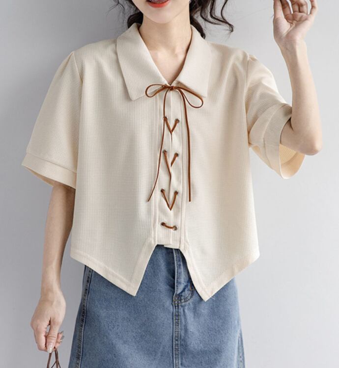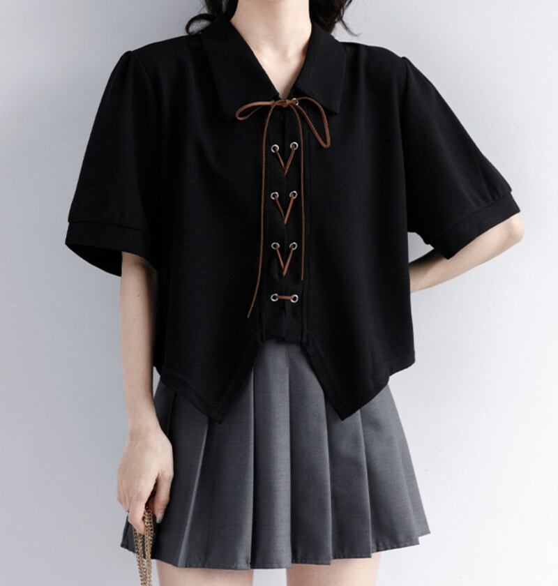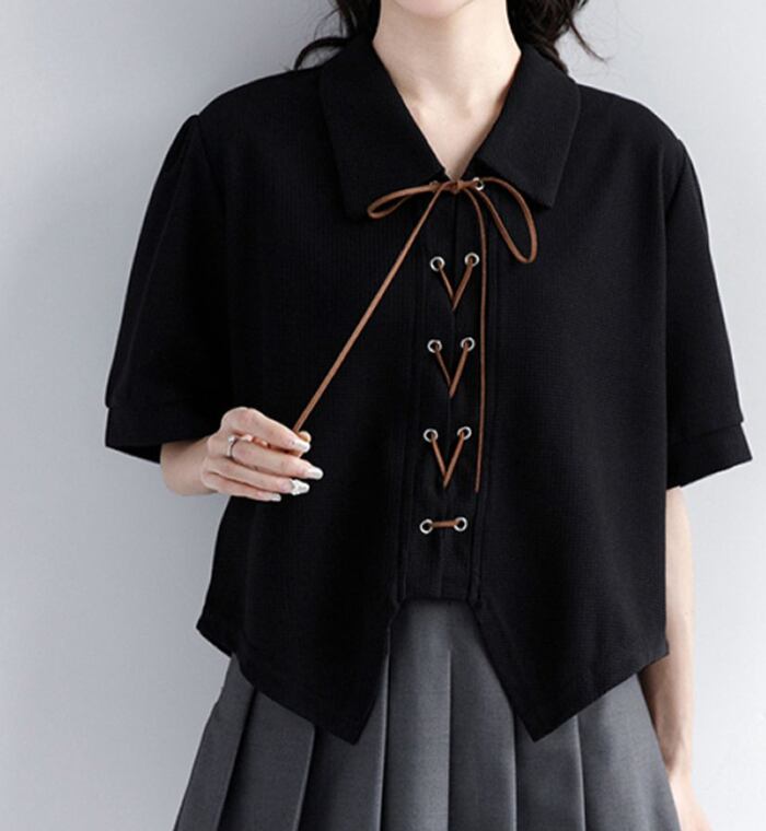 レースアップ シャツ 半袖 ショート丈 かわいい カジュアル おしゃれ 大人可愛い キュート 春 夏 通勤 通学 お出かけ 着回し 普段使い S M L 黒 ブラック アプリコット AS10417