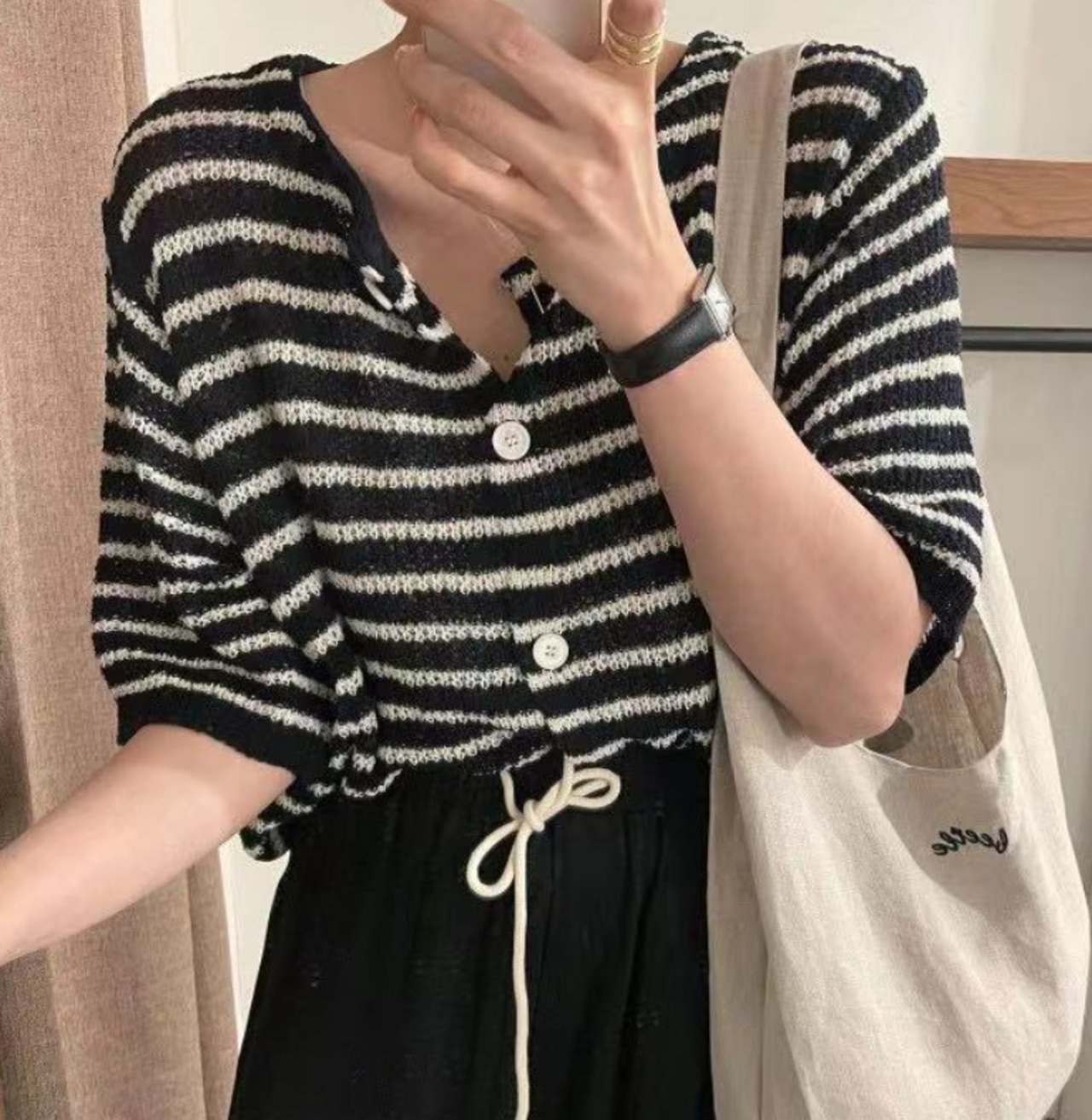 ボーダー柄の半袖セーター。