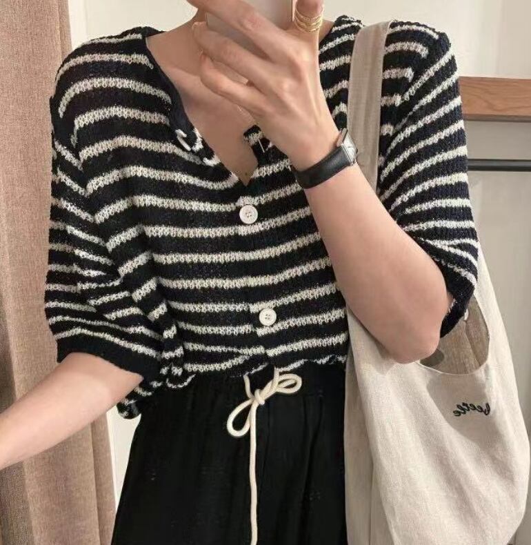 ボーダー柄 半袖 セーター トップス きれいめ 上品 おしゃれ お洒落 こなれ感 通勤 通学 デート お出かけ 着回し 普段使い フリーサイズ 白 ホワイト 黒 ブラック AS10419