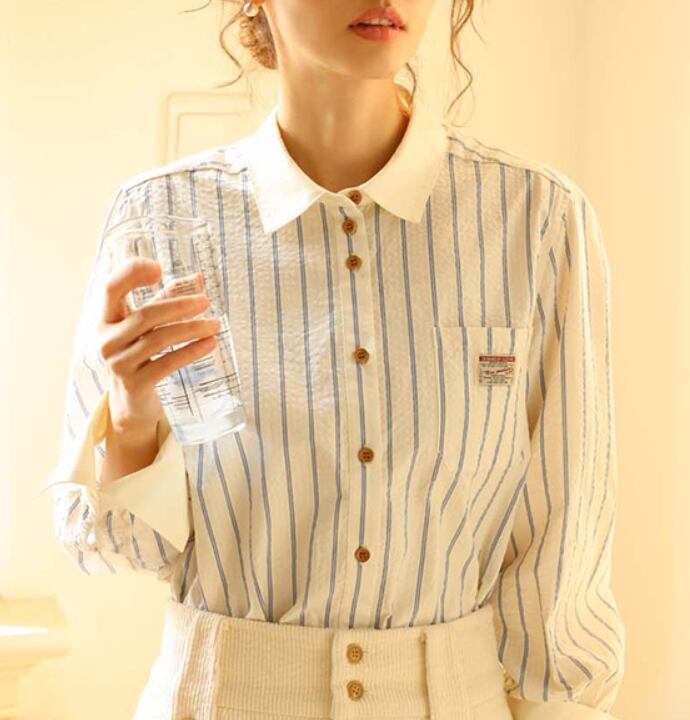 レトロ ストライプ柄 長袖 シャツ コットン トップス きれいめ 上品 おしゃれ お洒落 大人可愛い こなれ感 通勤 通学 お出かけ 普段使い 重ね着 S M アイボリー AS10427