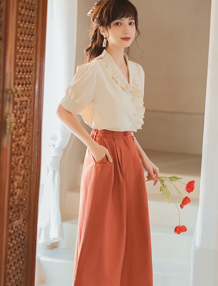 ブラウス スカート 2点セット セットアップ フレンチレトロ 半袖 ロングスカート パフスリーブ フレア きれいめ シンプル 大人 上品 おしゃれ 大人可愛い 春 夏 通勤 通学 お出かけ 普段使い S M L XL 白 ホワイト 赤 レッド AS10443