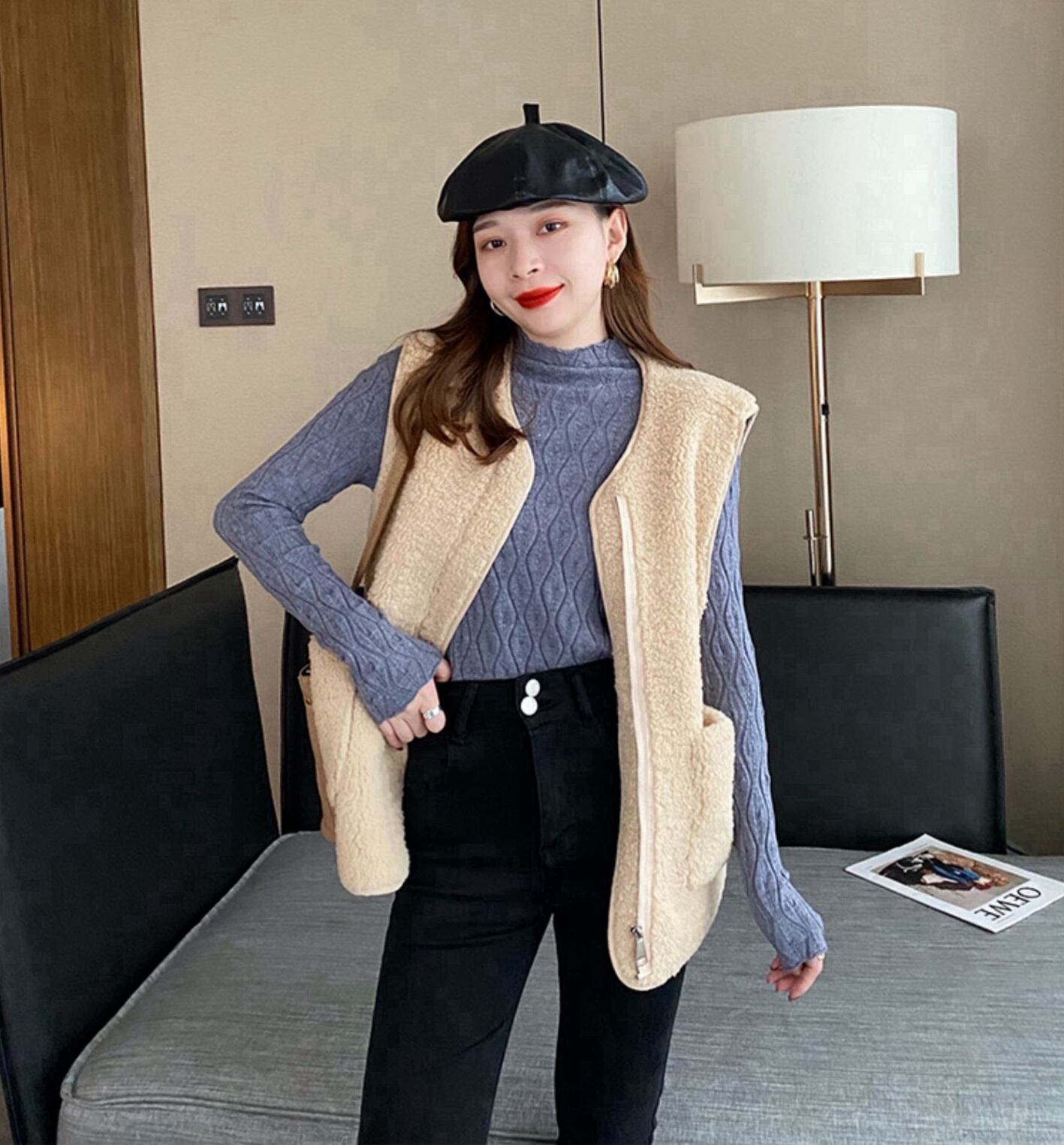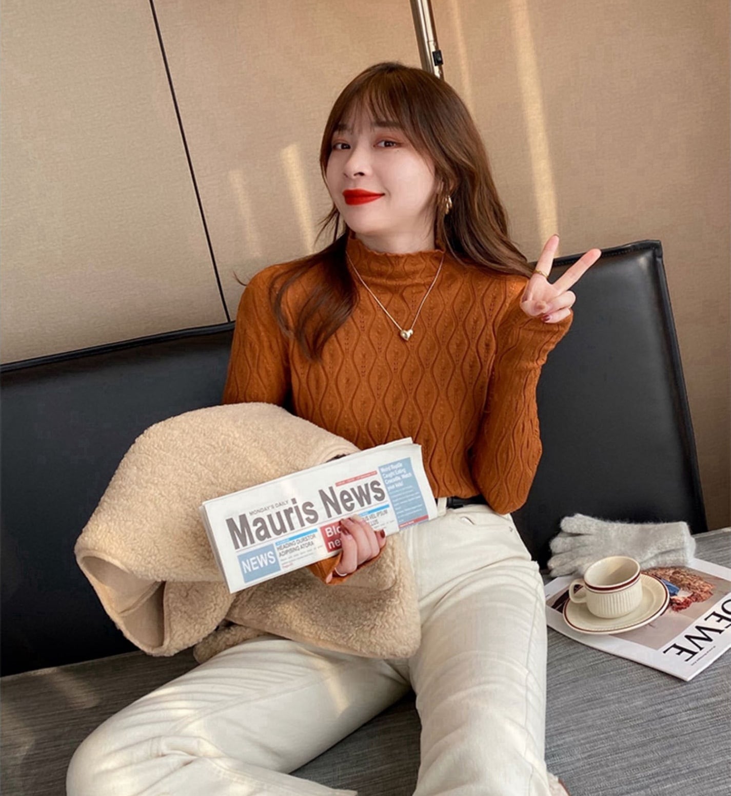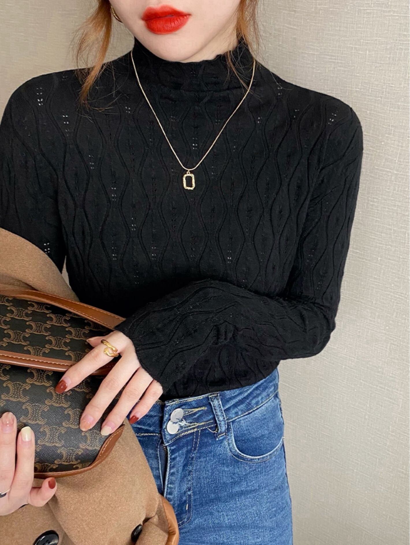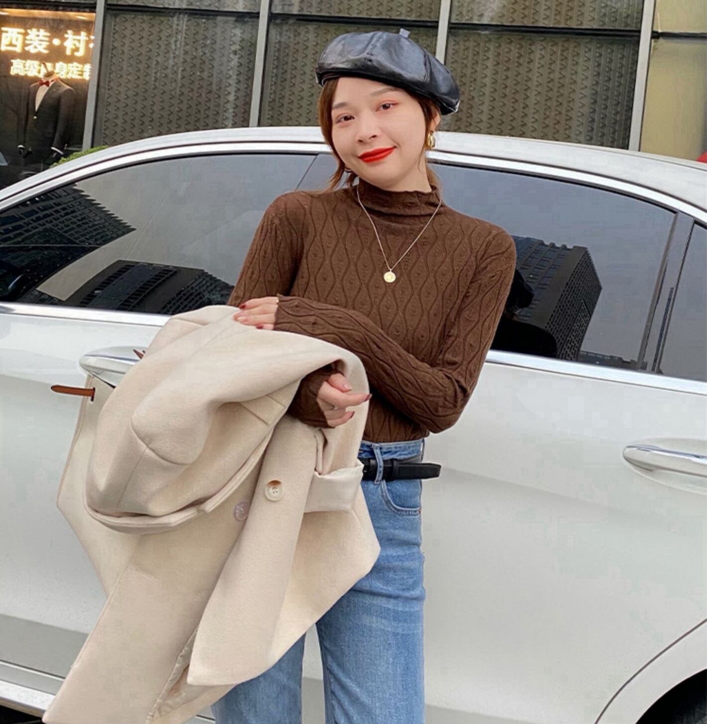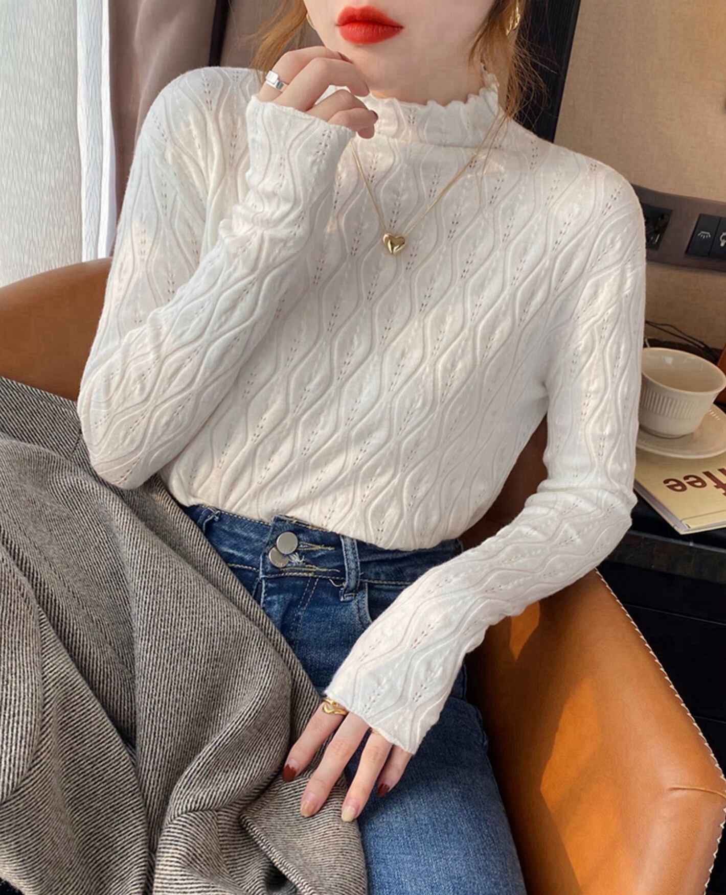 首元はハイネックで暖かく、メロウデザインで女の子らしい印象に。程よく身体にフィットしジャケットやコートのインナーなどに活躍します。