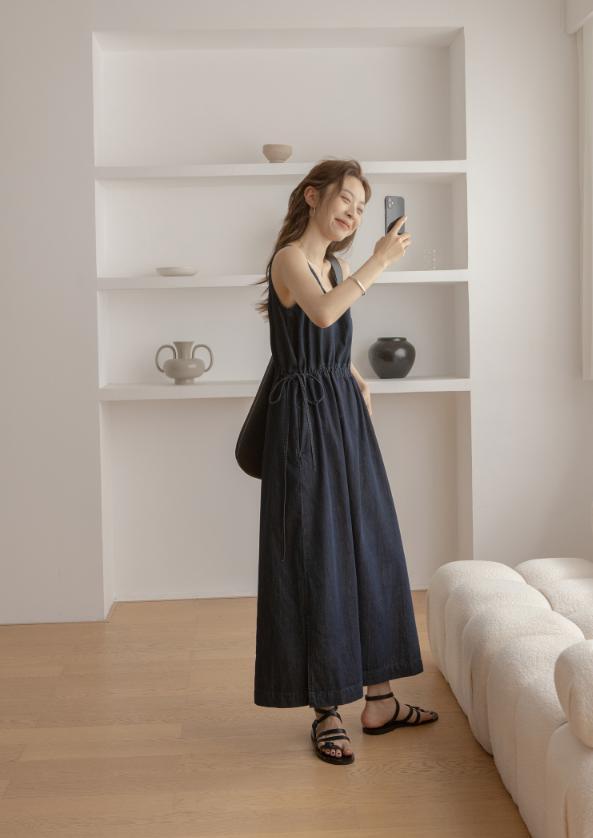 レディース ワンピース マキシ丈 ノースリーブ Uネック リボン 巾着ウエスト デニム お洒落 韓国系 ファッション KS10075