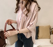 ストライプシャツ。シンプルなデザインで、どんなコーデにも合わせやすい。長袖で上品な印象を与えます。Vネックとスリムなシルエットで、女性らしいシルエットを強調します。きれいめにもカジュアルにも合わせやすい、大人可愛いトップスです。