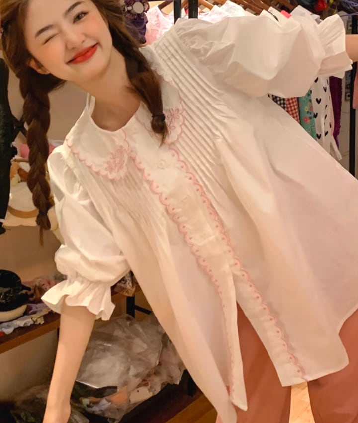 ビッグカラー ブラウス 刺繍 トップス シャツ 半袖 フレア かわいい おしゃれ レトロ キュート ガーリー 個性的 通勤 通学 お出かけ 着回し 普段使い 体系カバー フリーサイズ ゆったり 白 ホワイト 紫 パープル AS10461