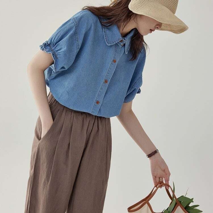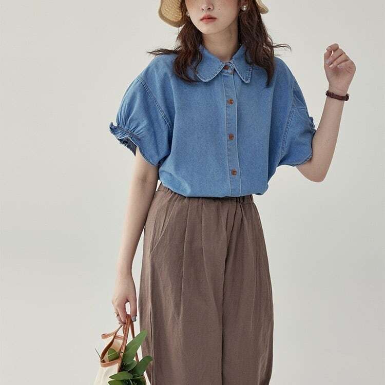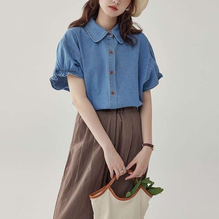 ふんわりパフスリーブがこなれ感を引き立てるデニムシャツ。