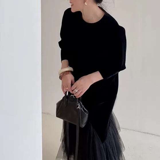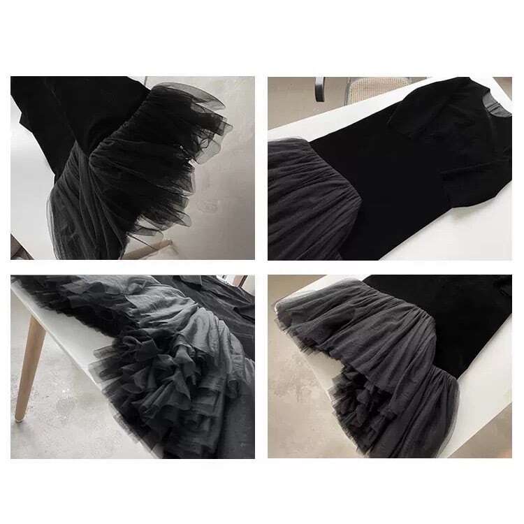 レディース チュール スカート ワンピース ミモレ丈 7分袖 ラウンドネック フレア ベルベット ブラック KS10151
