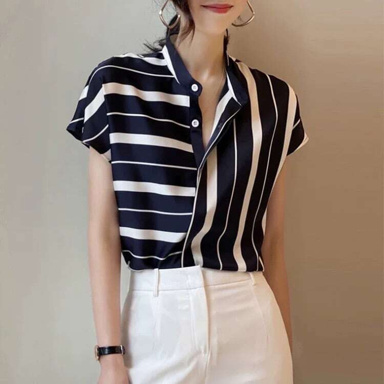 アシンメトリーデザインのストライプ柄が高級感ただようシャツブラウス。