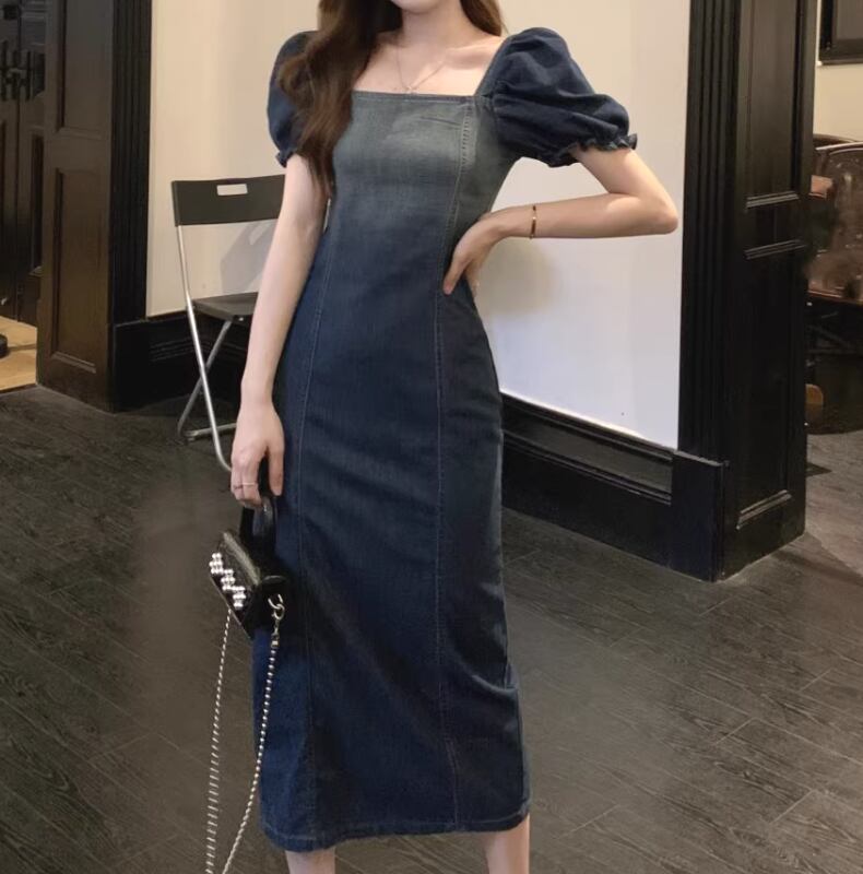 パフスリーブ ワンピース 半袖 バックスリット デニム グラデーション ロング丈 かわいい カジュアル おしゃれ お洒落 通勤 通学 無地 お出かけ 旅行 普段使い S M L ブルー AS10467