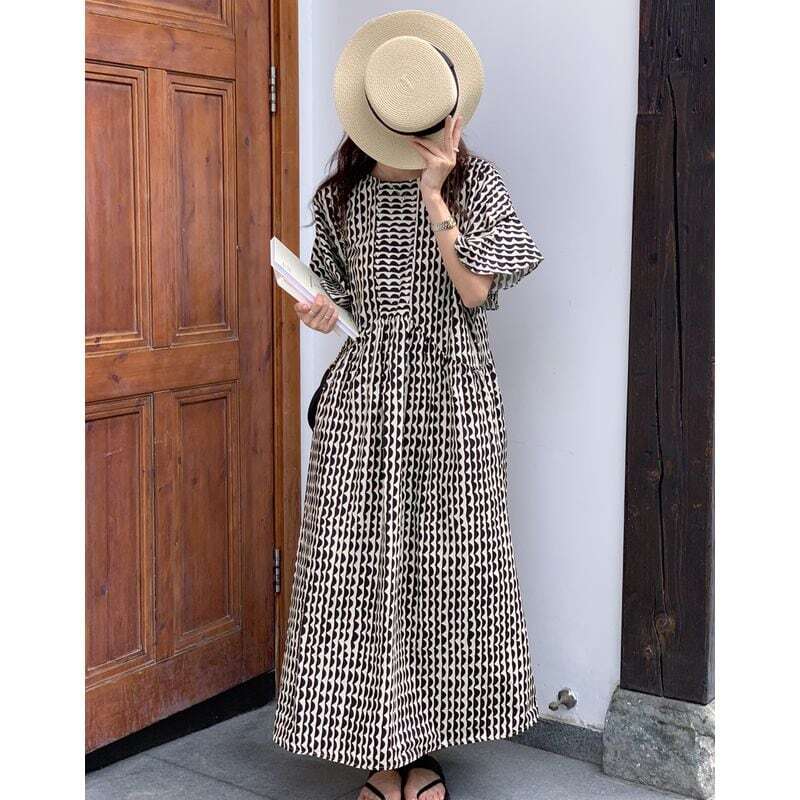 幾何学な柄がスタイルに映えるロングワンピースです。