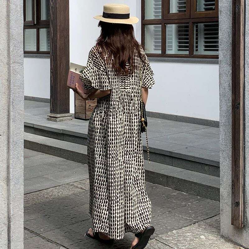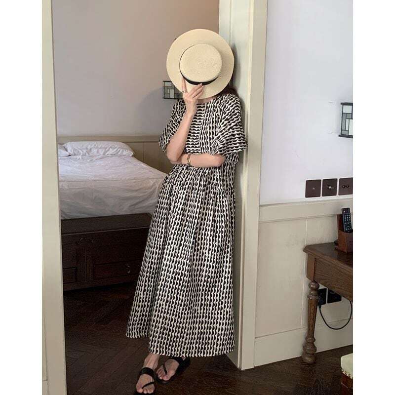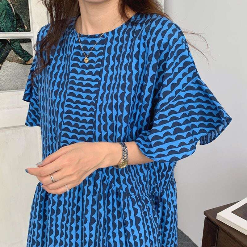 レディース フレアスリーブ ワンピース ロング丈 半袖 ラウンドネック 大人可愛い カジュアル 幾何学柄 デート お出かけ リゾート 普段使い KS10159