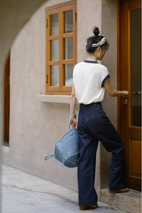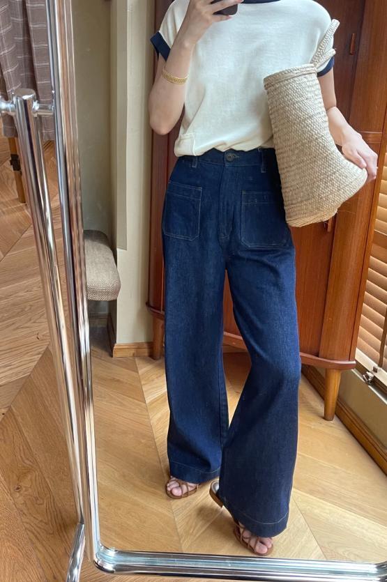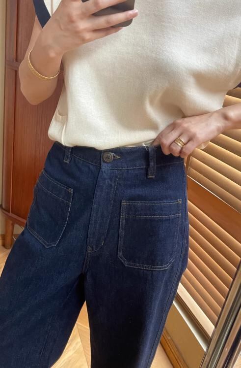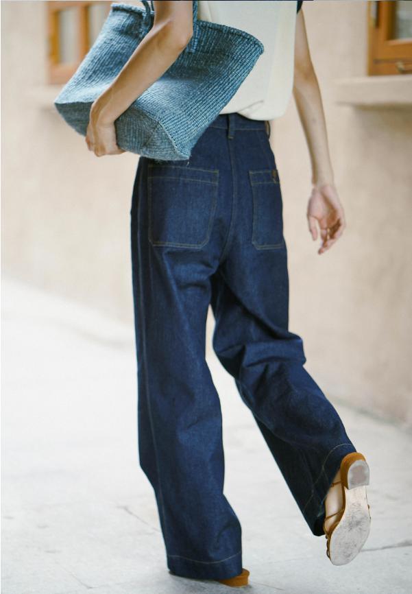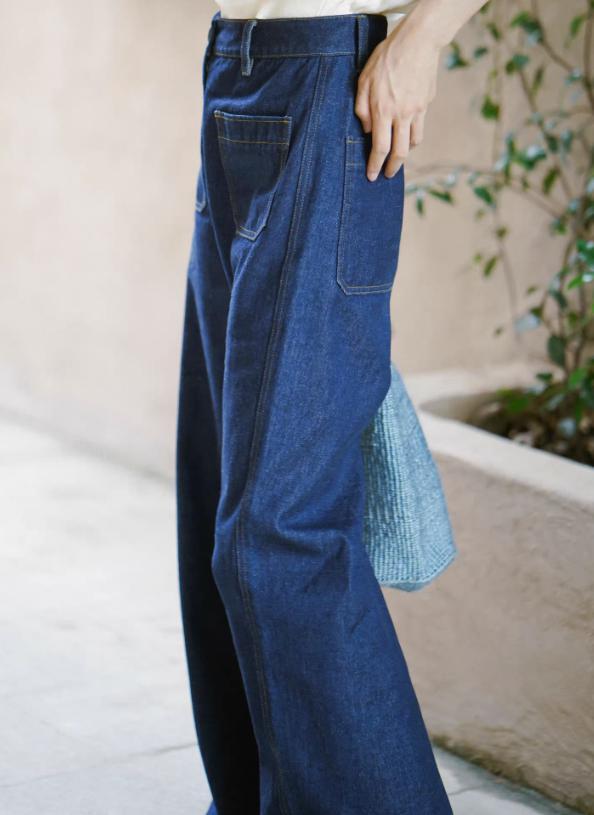 存在感のあるワイド幅デニムパンツ。スティッチ入りのポケットがアクセント。これ1本でトレンド感のあるコーディネートが完成します。