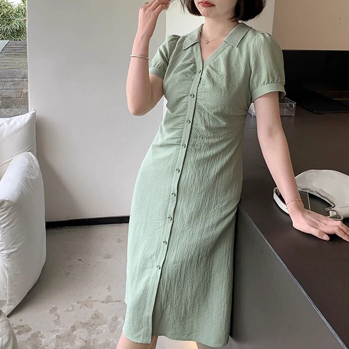 ワンピース ひざ丈 半袖 Vネック 細身 きれいめ シンプル 大人 上品 おしゃれ お洒落 こなれ感 無地 春 夏 通勤 通学 お出かけ 普段使い S M L XL 2XL 3XL 黒 ブラック 緑 グリーン AS10468