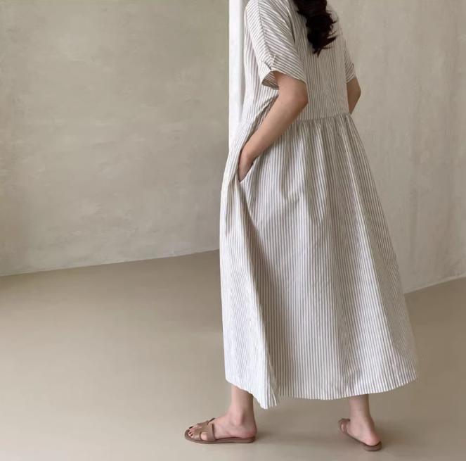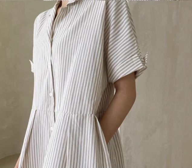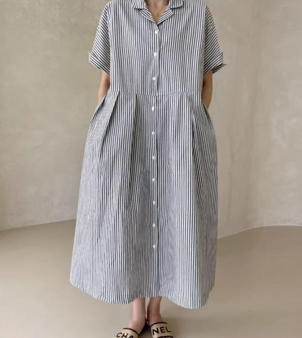レディース 開襟 シャツ ワンピース ミモレ丈 半袖 Aライン シンプル カジュアル 大人 お洒落 ストライプ 2Collar KS10182