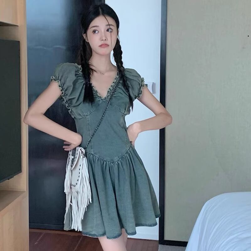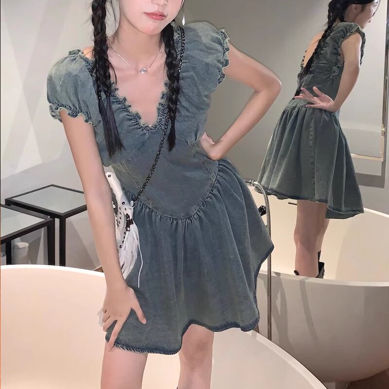 Vネック デニム ワンピース 半袖 パフスリーブ ミニ丈 可愛い ガーリー おしゃれ お洒落 お出かけ 春 夏 普段使い S M L ブルー AS10486