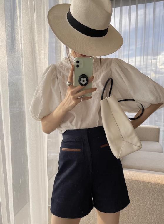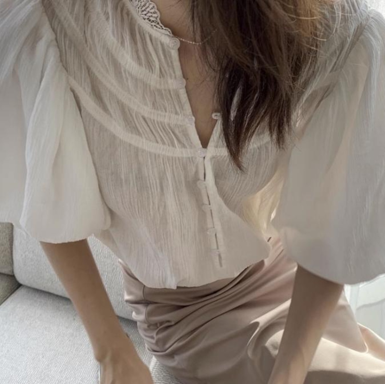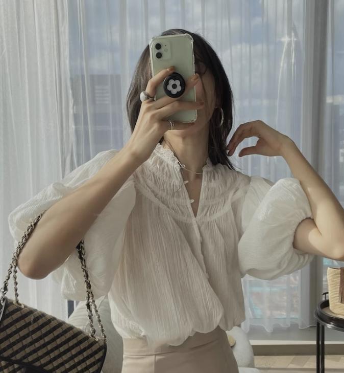 ふんわりとしたパフスリーブが女性らしい雰囲気を演出する2way puff sleeve blouse。