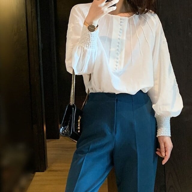 パフスリーブに美しいお花の刺繍のある、上品ブラウス。袖口はギャザー、くるみボタンでさりげないおしゃれです。