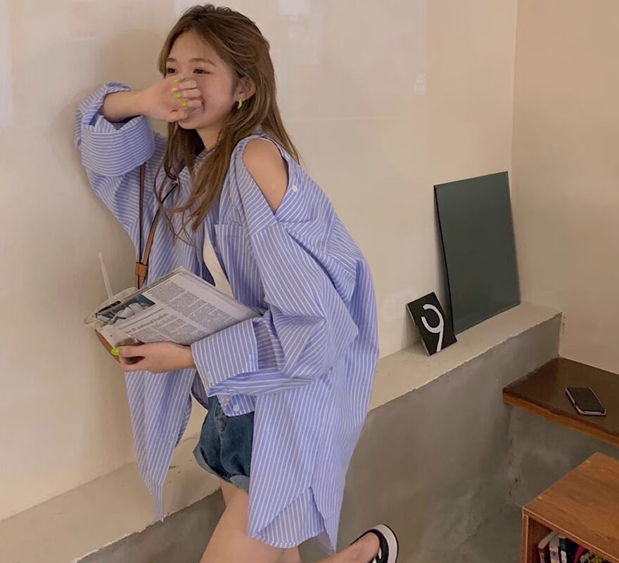 ストライプ シャツ 長袖 オフショルダー トップス ロング丈 カジュアル おしゃれ 大人女子 こなれ感 ラフ メンズライク ボーイッシュ スポーティー お出かけ アウトドア リゾート 旅行 着回し 普段使い 重ね着 S M L XL 青 ブルー AS10497