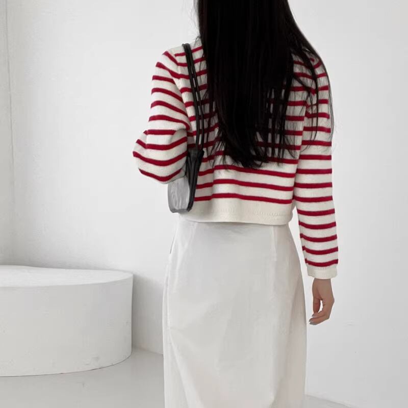 ボーダー ショート丈 カーディガン トップス きれいめ おしゃれ お洒落 大人女子 こなれ感 秋 冬 通勤 通学 デート お出かけ 着回し 普段使い 重ね着 黒 ブラック 赤 レッド AS10503