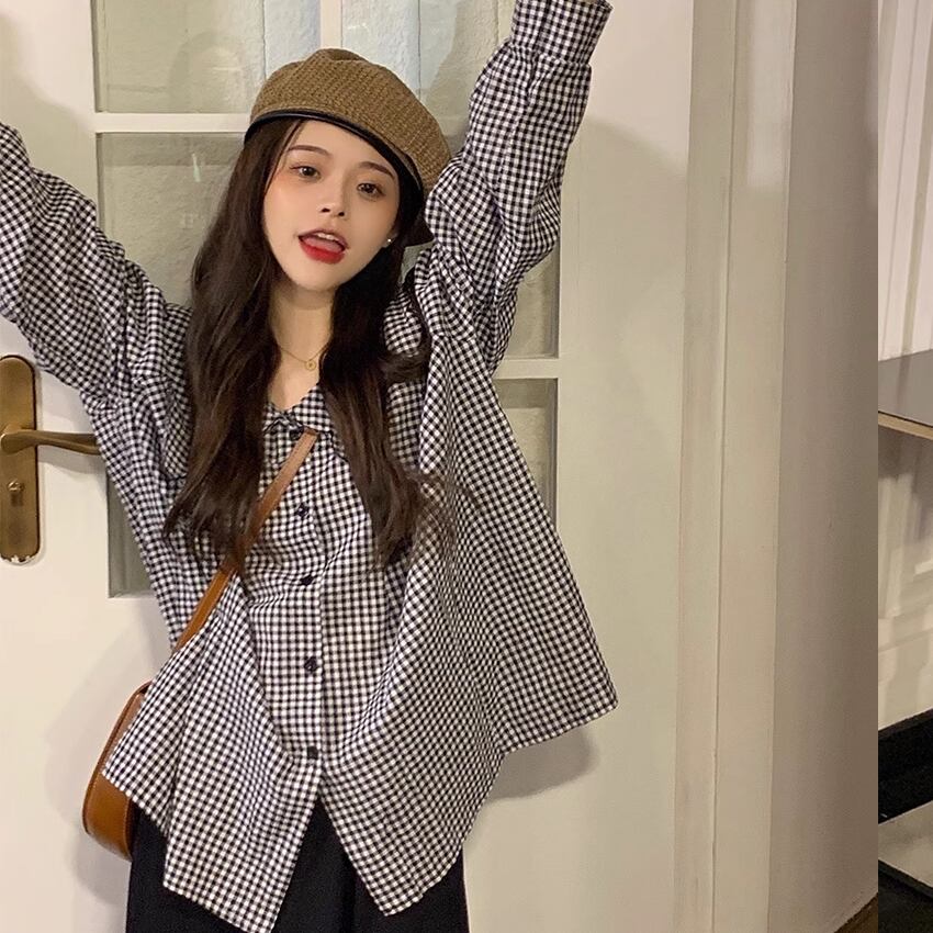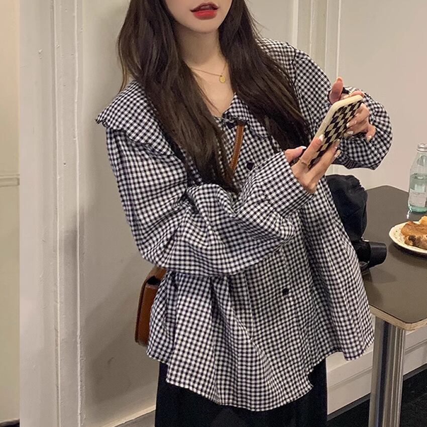 ビッグカラー チェック柄 シャツ 長袖 トップス オーバーサイズ レトロ 可愛い おしゃれ ガーリー キュート 通勤 通学 旅行 着回し 普段使い 大きいサイズ 体型カバー S M L XL 2XL 3XL 4XL モノトーン AS10511