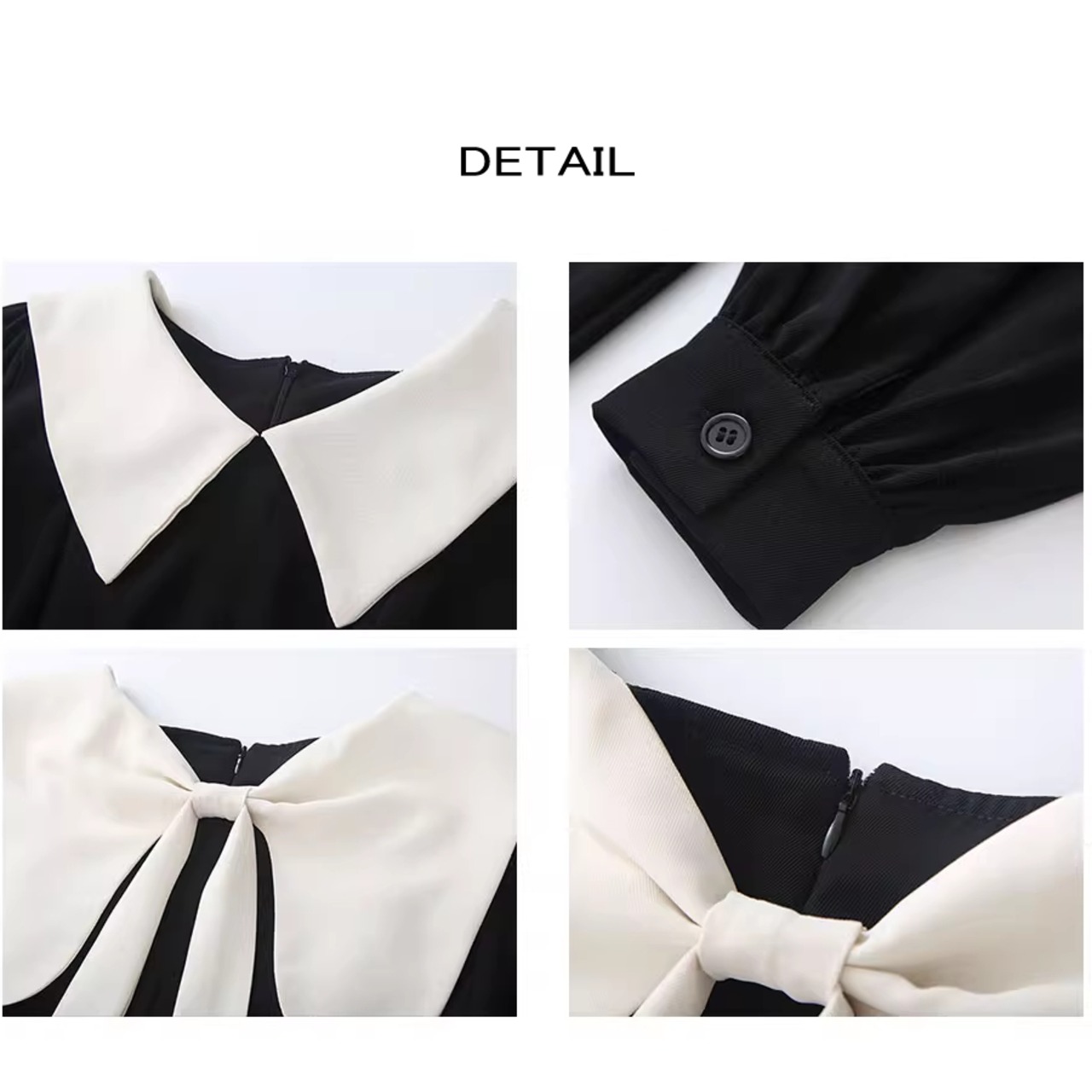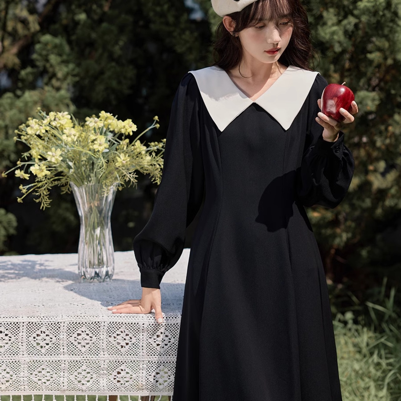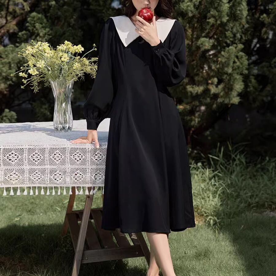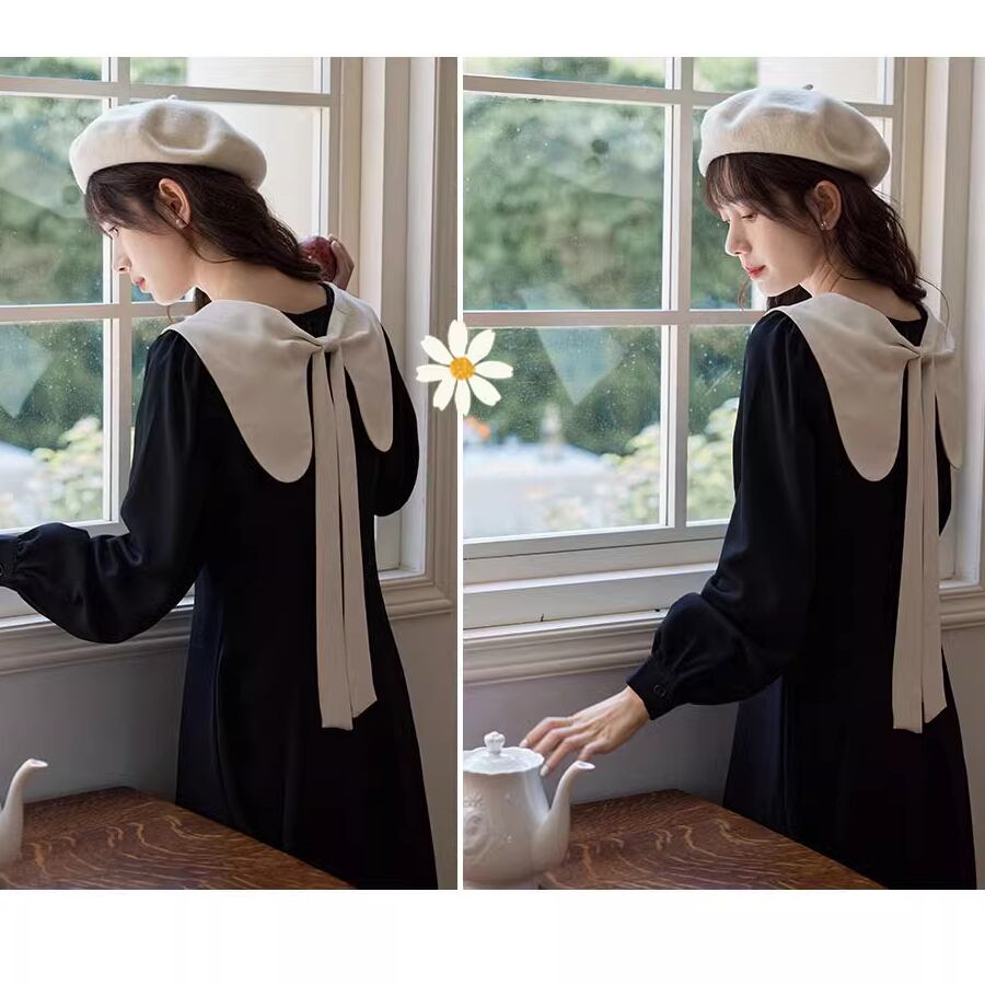 バックリボン ワンピース ロング丈 長袖 レトロ 可愛い ガーリー ビッグカラー セーラーカラー S M L 黒 ブラック AS10512