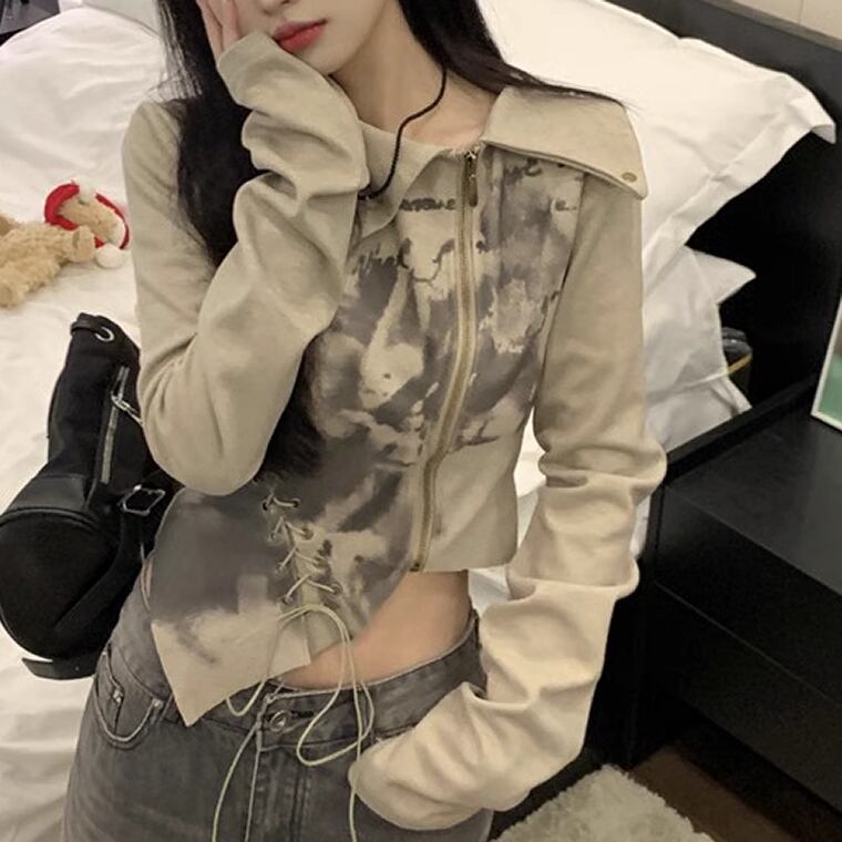 レースアップ トップス ビッグカラー カットソー 長袖 変形 L XL 2XL 3XL 4XL グレー 大きいサイズ AS10514