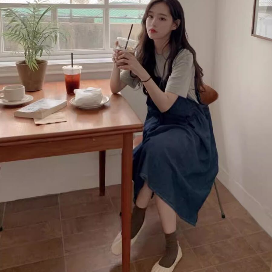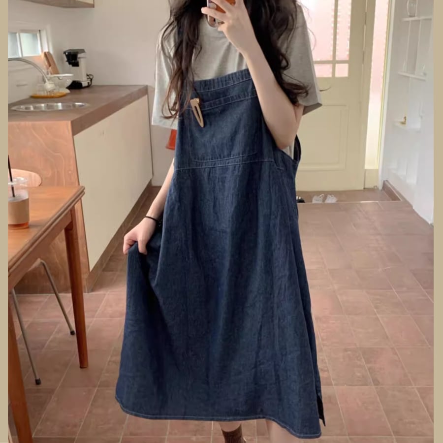 デニム ジャンパースカート シンプル ロング丈 サイドスリット サロペット AS10515