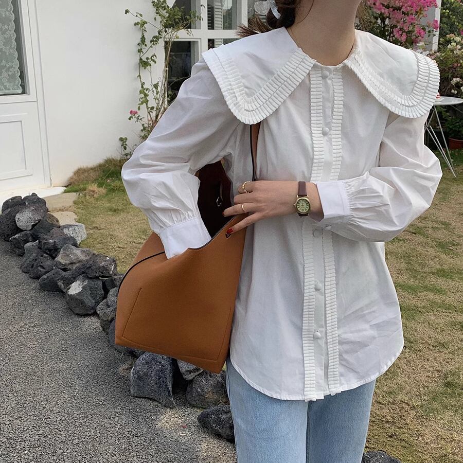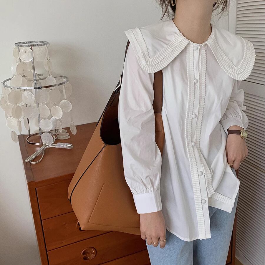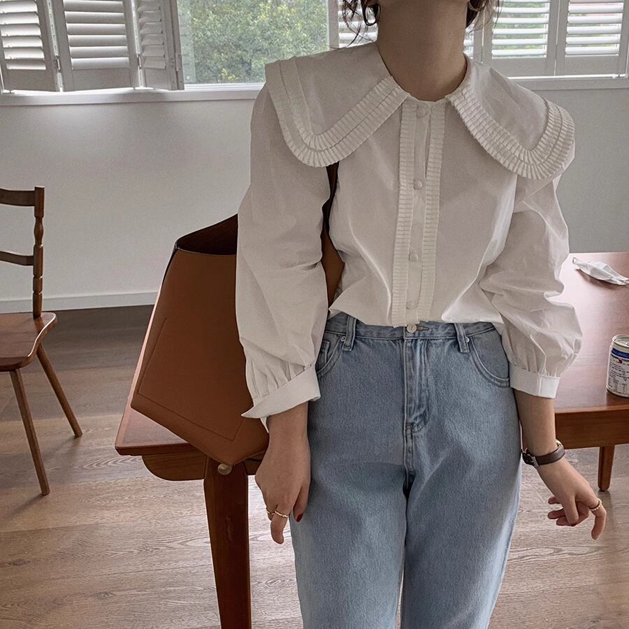 レディース ブラウス トップス ビッグカラー アコーディオン プリーツ ガーリー 白 青 ホワイト ブルー AS10532