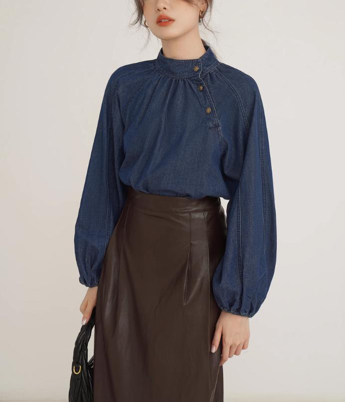 レディース トップス ハイネック リボン デニム ブラウス KS10246
