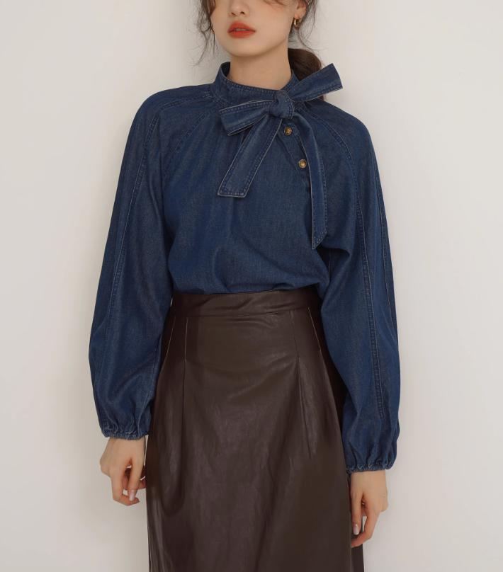 2wayで着こなしを楽しめるボウタイデニムブラウス。