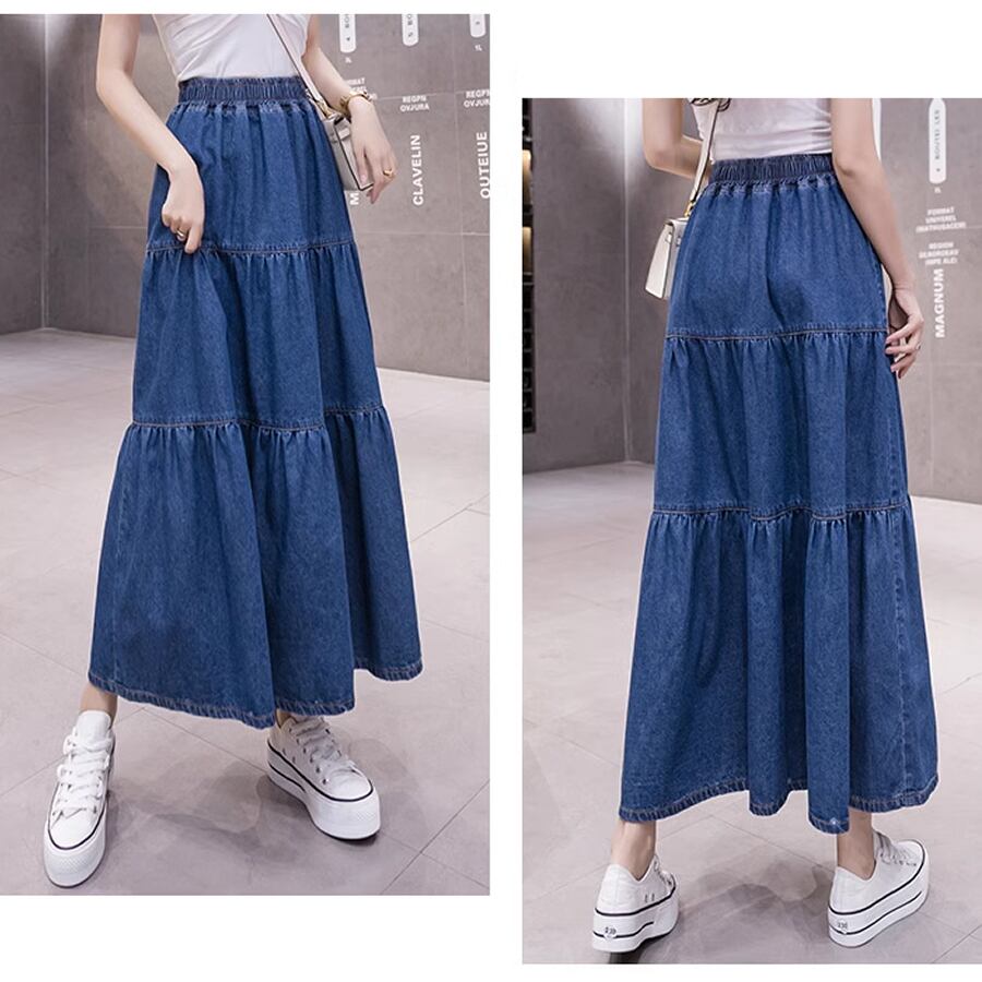 デニム スカート ロング丈 ティアード ウエストゴム 大きいサイズ S M L XL 2XL 3XL 4XL 5XL 青 ブルー AS10541