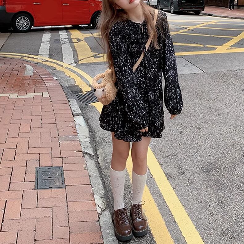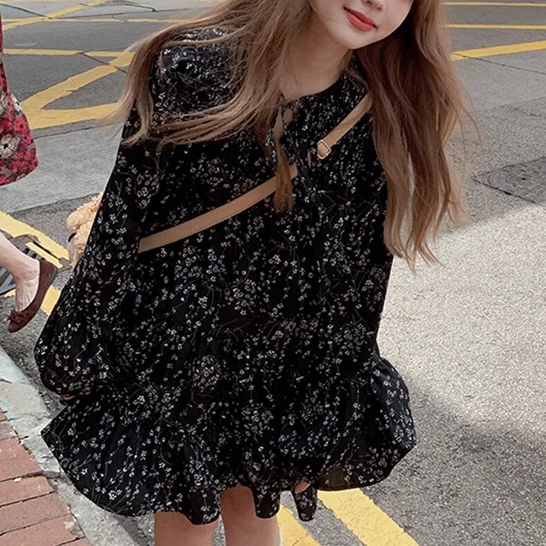 レディース レトロ 花柄 ワンピース ミニ丈 長袖 黒ブラック AS10549