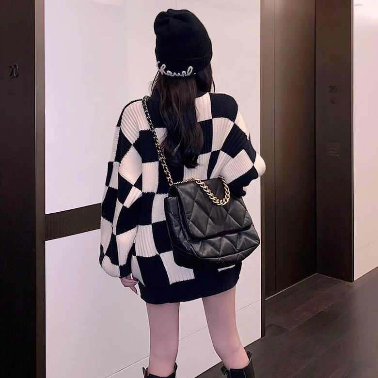 レディース ニット セーター レトロ ブロックチェック 長袖 チェック柄 ロング丈 S M L XL 2XL モノクロ 白黒 AS10552