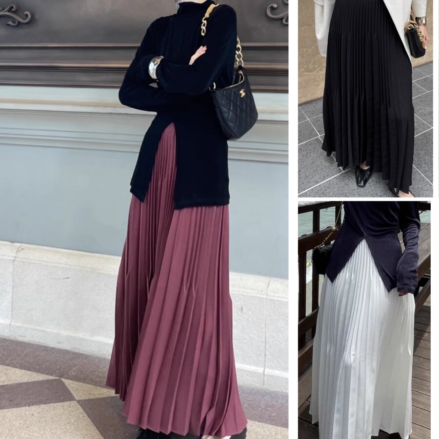 ふんわりと柔らかい雰囲気のプリーツロングスカート。