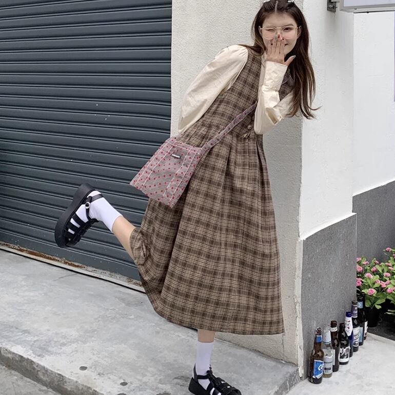 レディース ジャンパースカート チェック柄 レトロ フレンチスタイル ロング丈 ブラウン AS10582