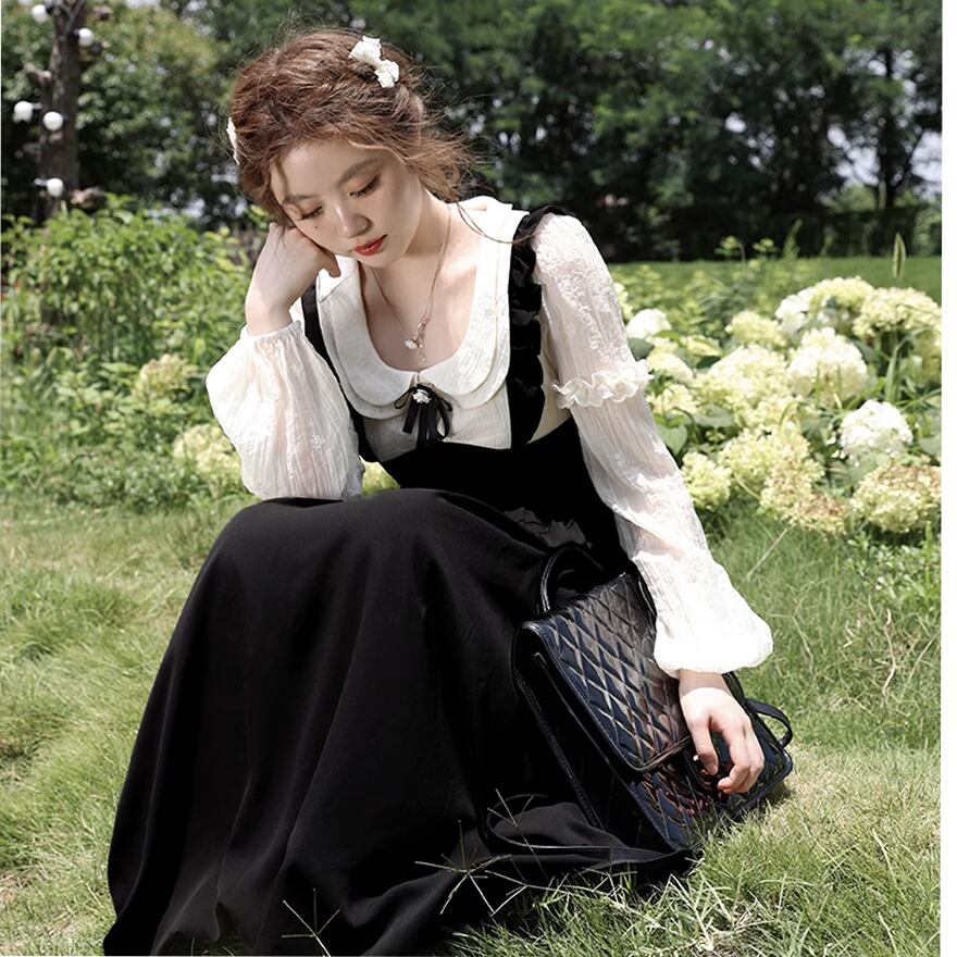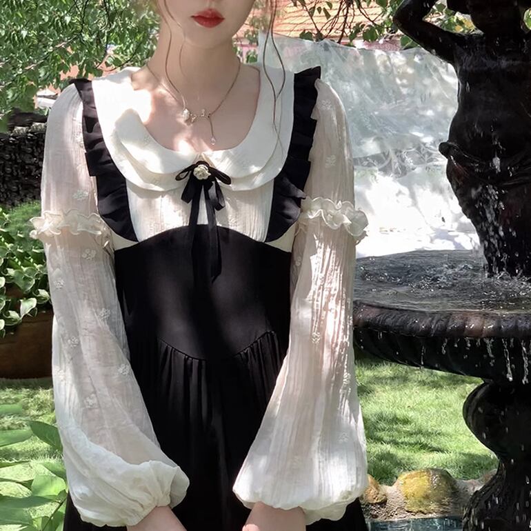 レディース ワンピース 長袖 ドッキング フリル ロング丈 フレアスカート M L XL 2XL 3XL 白黒 モノトーン AS10584