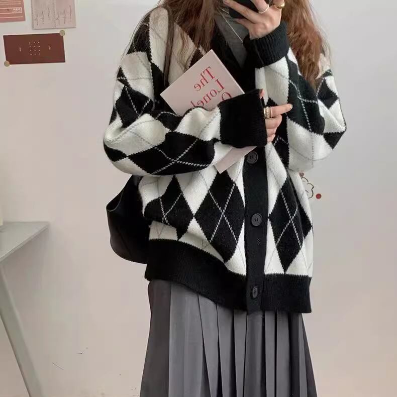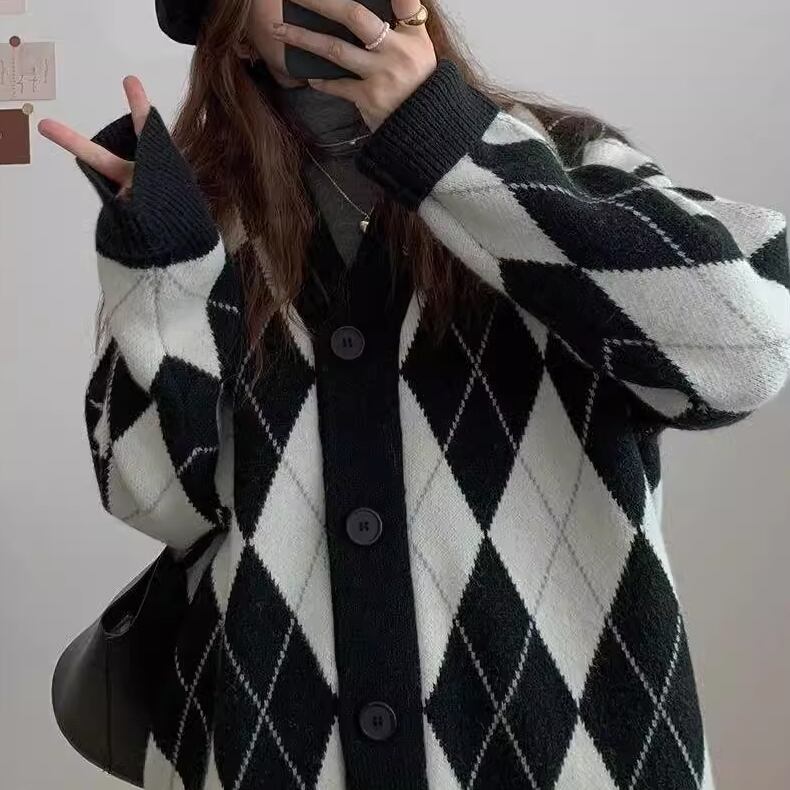 レディース アーガイル柄 ニット カーディガン Vネック S M L XL 2XL ピンク ブラック AS10590
