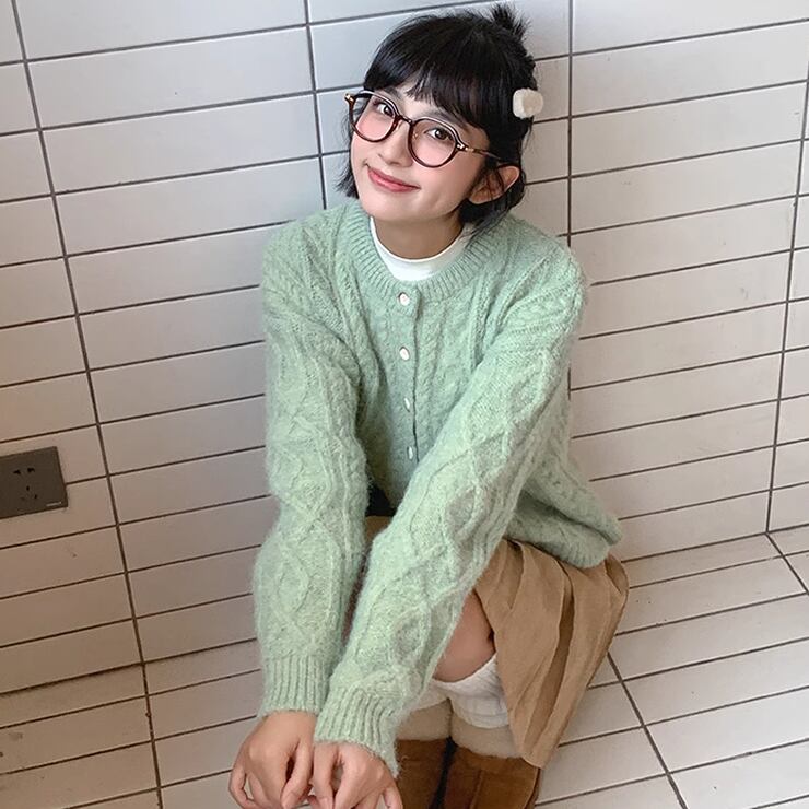 レディース ニット カーディガン クルーネック 長袖 S M L ピンク ホワイト グリーン AS10591