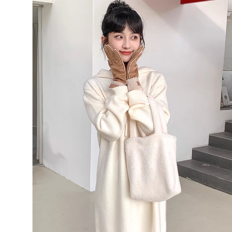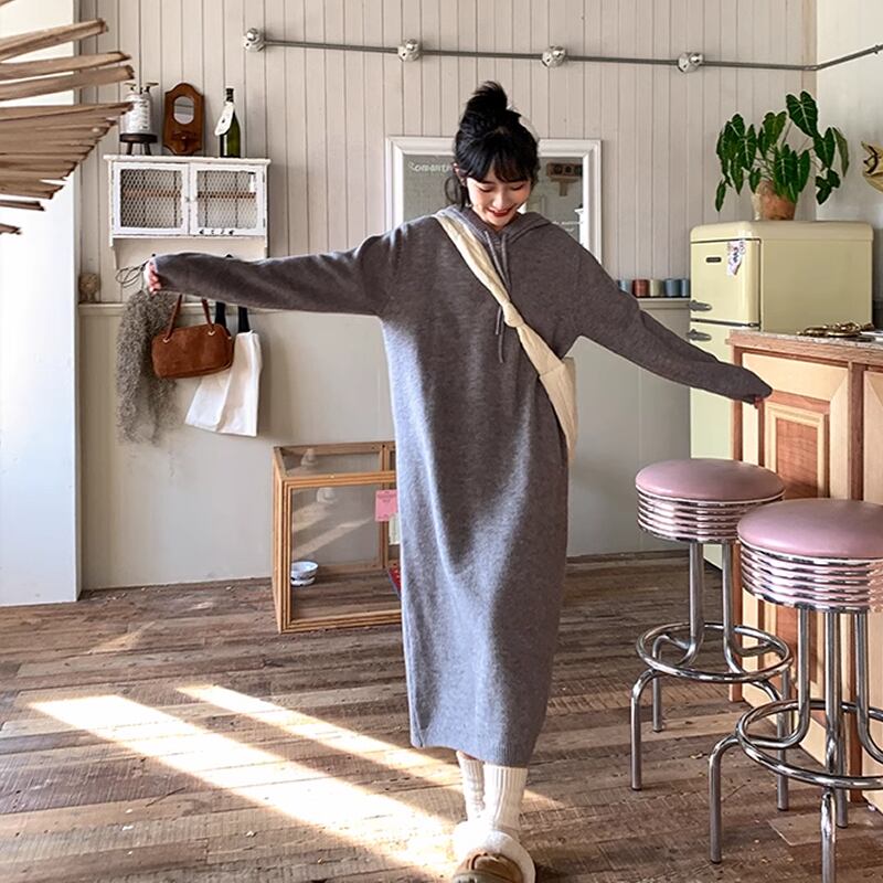 一枚で大人カジュアルが完成するフード付きニットワンピース。